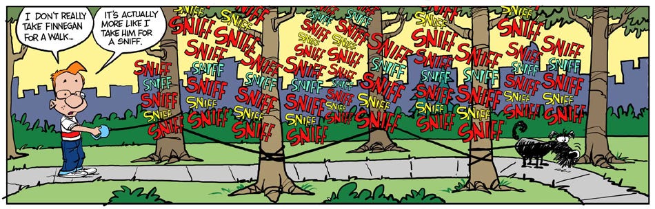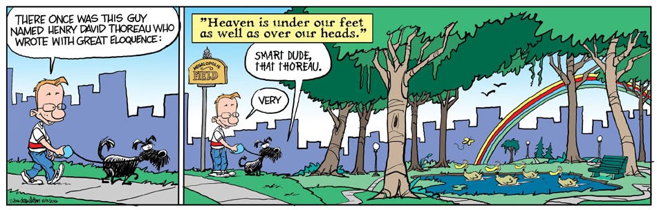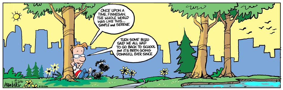 Finn and I settled in the Centennial area where we found an appropriate park to continue our strolls and later to Arvada where we located another great park with a large pond and ducks. Lotsa Ducks. It was at that time I decided to create the comic Strip “Finnegans Field”.